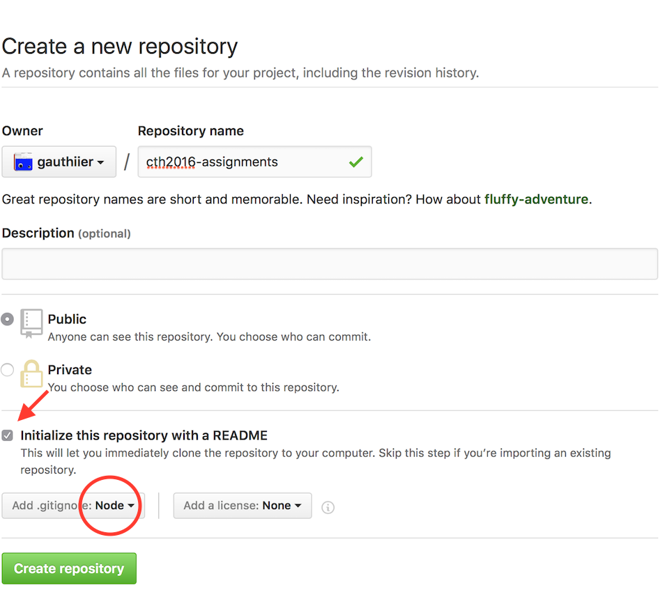 * Note 1: Select "Initialize this repository with a README" * Note 2: From the "Add .gitignore" drop down menu, selecte Node